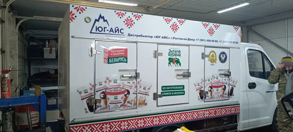 Учёт кривизны кузова, ручек и дверей. Интеграция логотипа «ЮГ-АИС», бренда «Зелёная бурена», изображений продукции и контактов.