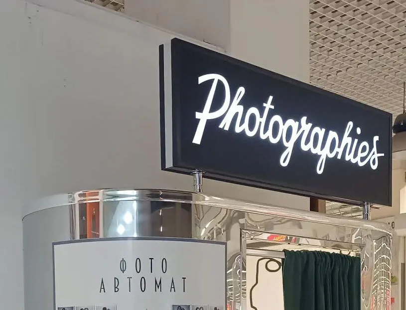 Перед вами пример изготовления и монтажа светового короба и информационной таблички для фотобудки (фотоавтомата) под брендом «Photographies». Проект реализован на первом этаже торгового центра «МегаМАГ» в Ростове-на-Дону. Задача заключалась в создании и установке верхней световой вывески с рукописной надписью и передней информационной панели с ценой и примерами снимков.