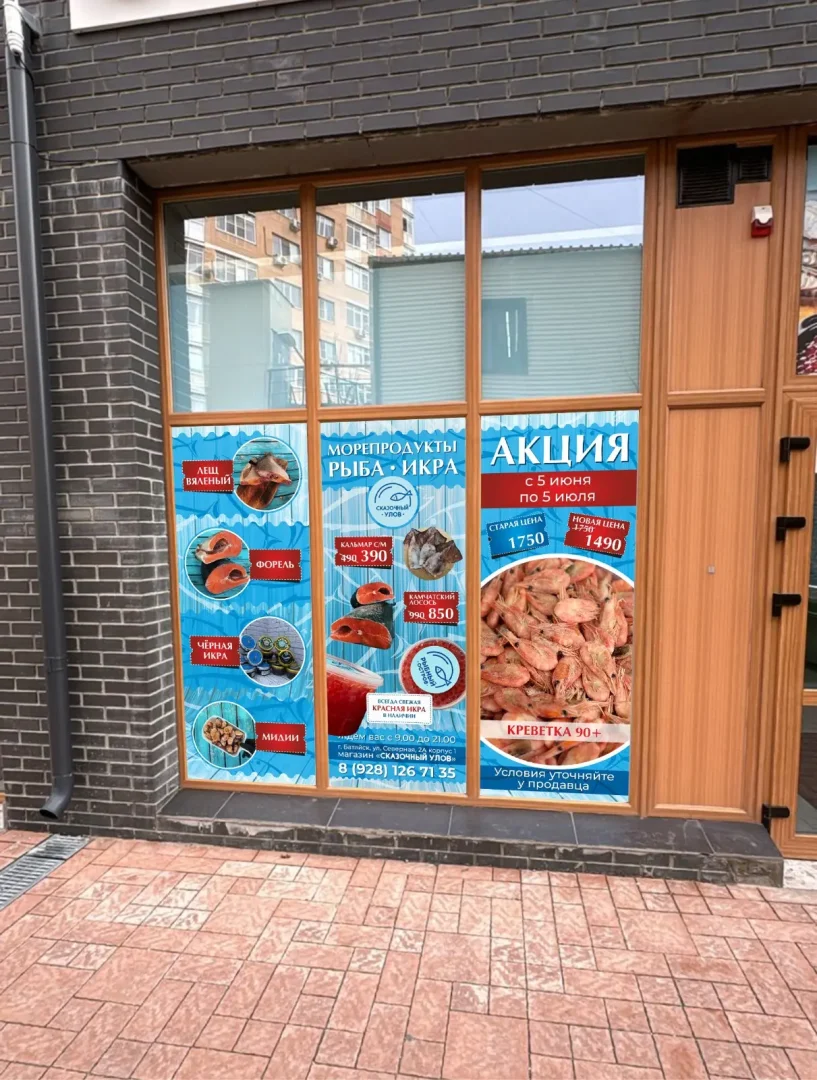 Перед вами пример комплексного оформления витрины магазина морепродуктов «Сказочный улов» в городе Батайск Ростовской области. Проект включал в себя изготовление и монтаж наклеек на стеклянные витрины с использованием сплошной и перфорированной самоклеящейся пленки, а также защитную ламинацию. Задача заключалась в создании яркого, информативного оформления, которое привлекает внимание покупателей и четко доносит информацию об ассортименте, акциях, контактах и режиме работы.