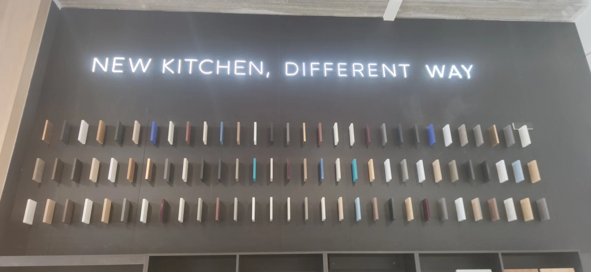 Перед вами пример демонстрационной стены с образцами материалов для кухонной мебели, где функциональный элемент интерьера становится эффективным инструментом брендинга и визуализации. Проект демонстрирует, как сочетание светящегося слогана и структурированной сетки образцов помогает клиентам оценить варианты фасадов, а также подчёркивает инновационный подход компании к дизайну кухонь.