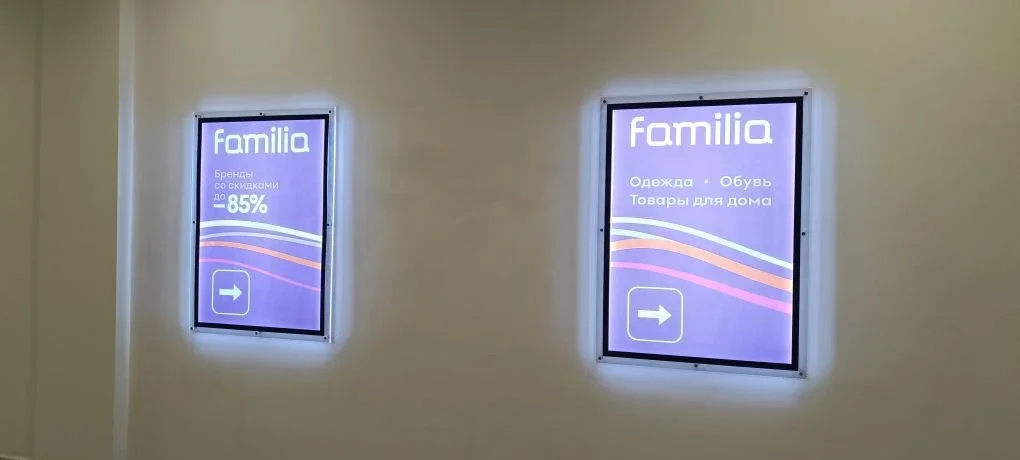 Задача: разработать дизайн, изготовить и смонтировать две клик-рамки с внутренней LED-подсветкой, содержащие информацию о скидках и ассортименте магазина «Familia», а также стрелки-указатели для навигации. Обеспечить возможность быстрой замены рекламного контента и последующее сервисное обслуживание.