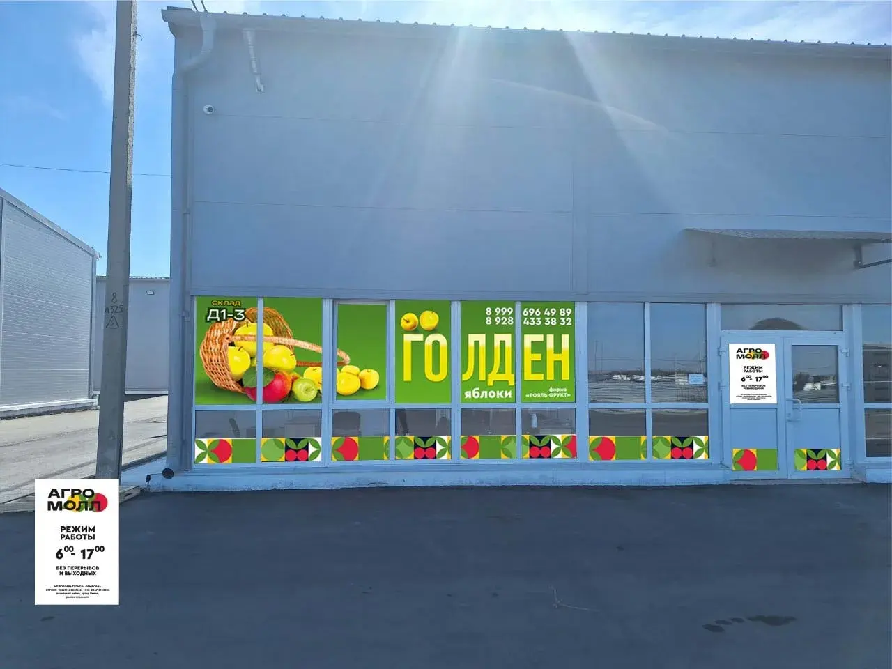 Перед вами пример комплексного оформления фасада торговой точки по продаже яблок сорта «Голден» на рынке «Агромолл» (Ростов-на-Дону, ул. Тенистая 15). Мы разработали дизайн, изготовили и смонтировали два типа рекламы: оклейку окон перфорированной плёнкой (с изображением корзины яблок, названием, контактами) и крупный баннер на фасаде для складов Д1-3 и Д2-3. В работе представлены три фотографии: дизайн-макет, готовый результат на складе Д1-3 и отдельный баннер для склада Д2-3. Единый зелёно-жёлтый стиль и аппетитная графика привлекают внимание посетителей рынка и информируют о продукции, режиме работы и контактах.