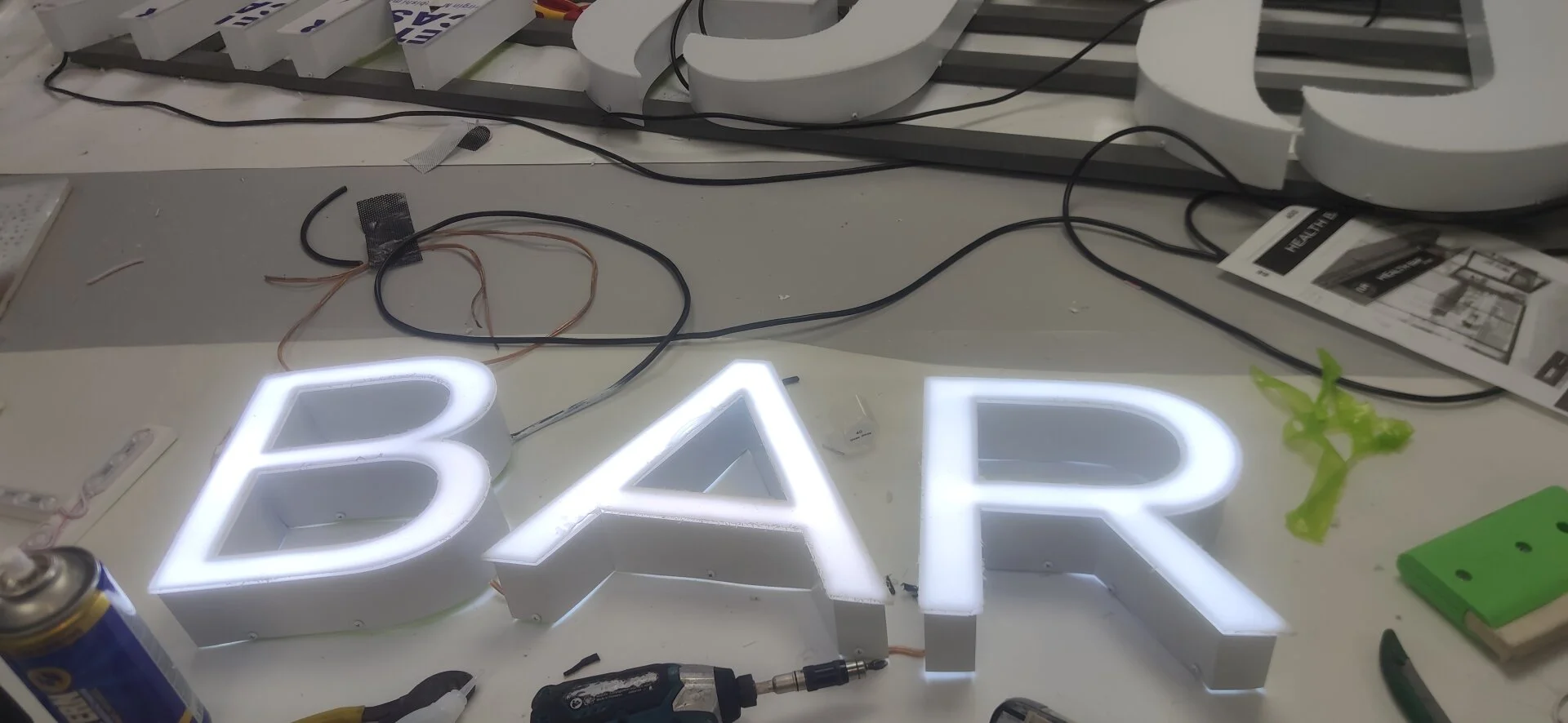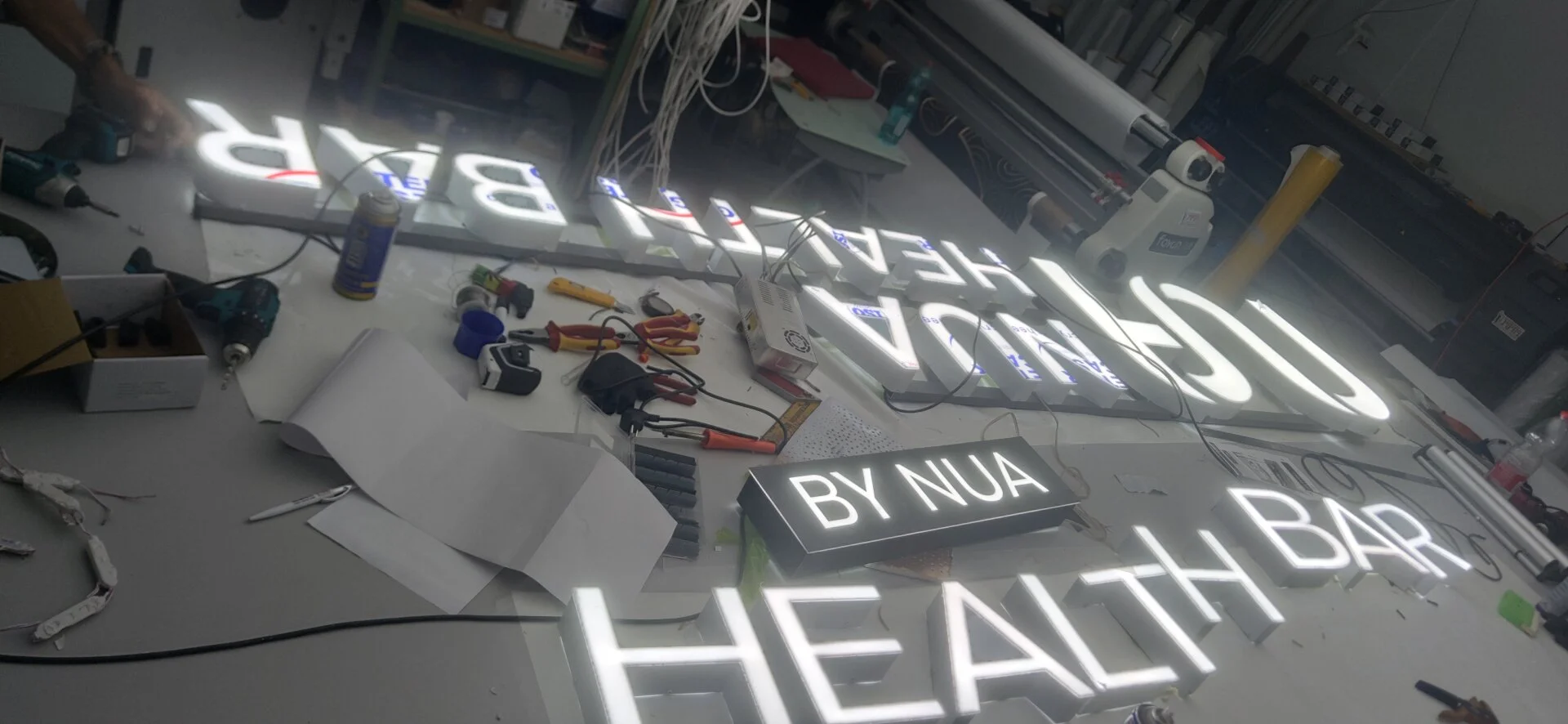 Перед вами пример производственного процесса изготовления объёмной световой вывески для заведения HEALTH BAR by NUA. Этот проект демонстрирует наш профессионализм в создании современных рекламных конструкций, где важны качество материалов, точность сборки и внимание к деталям на каждом этапе — от монтажа каркаса до герметизации стыков.