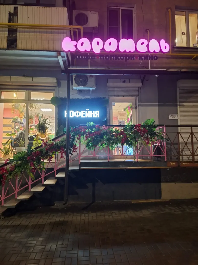 Перед вами пример изготовления и монтажа объемных световых букв для кафе и развлекательного пространства «Карамель» по адресу ул. Максима Горького, 73/81А в Ростове-на-Дону. Проект включал в себя создание основной вывески с названием «Карамель», дополнительной надписи «попкорн кино», а также отдельной световой вывески «Кофейня». Задача заключалась в разработке яркого, запоминающегося оформления фасада, которое подчеркивает концепцию заведения и привлекает внимание в любое время суток.