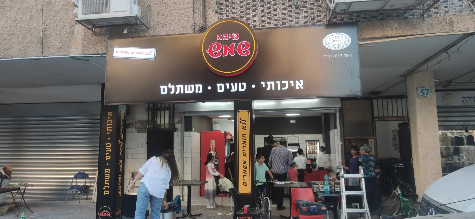Белая надпись на иврите под логотипом — чётко и читаемо. Дополнительные мелкие таблички завершают композицию.