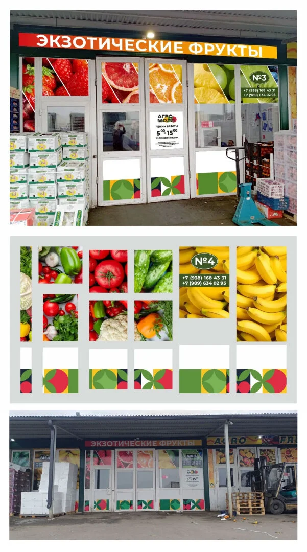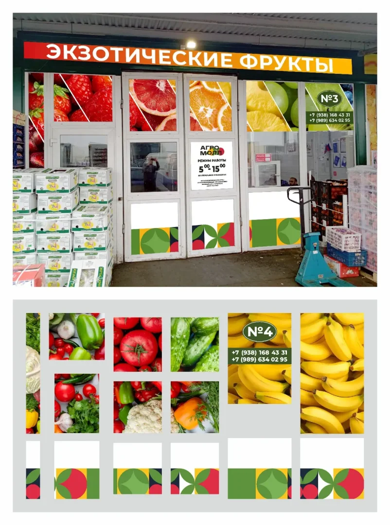 Дизайн, печать и монтаж пленки для торгового павильона «Экзотические фрукты» на рынке «Агромолл»