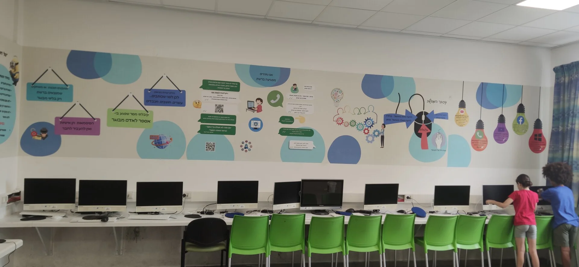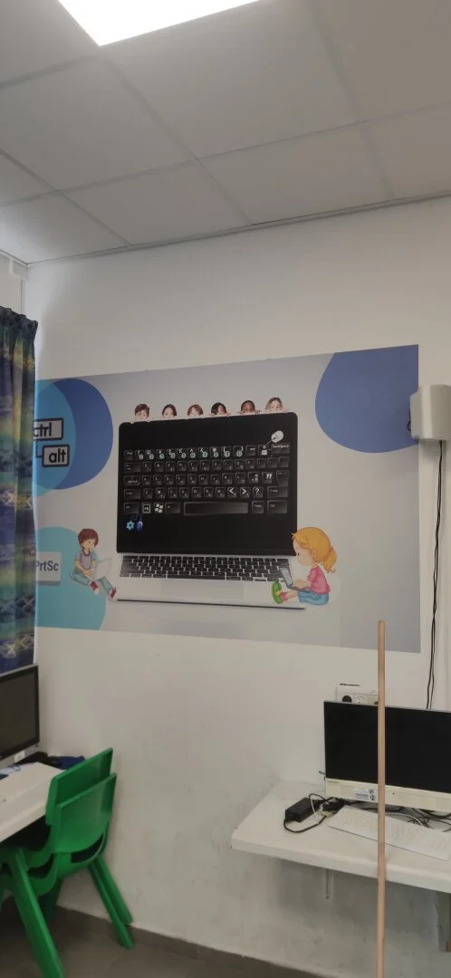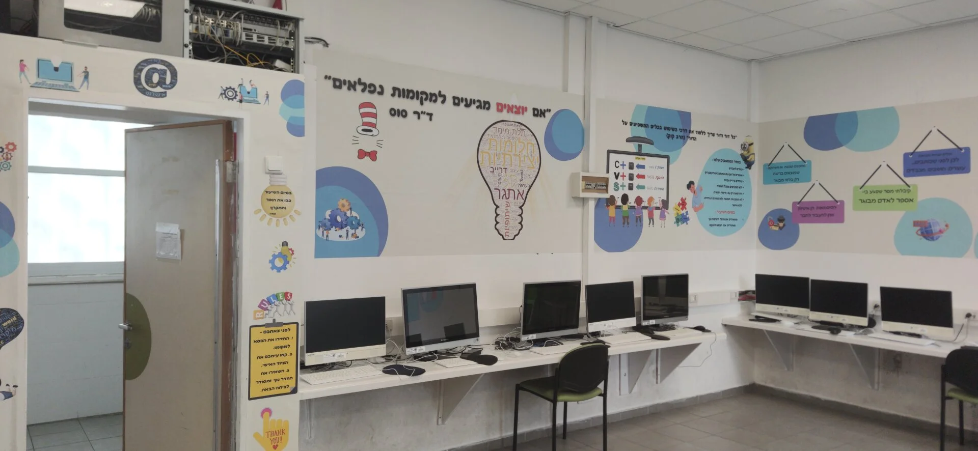 Перед вами пример комплексного оформления учебного класса (компьютерный класс) для школы или учебного заведения в Израиле. Этот проект демонстрирует наш профессионализм в создании мотивирующей образовательной среды, где дизайн сочетает функциональность, образовательный потенциал и визуальную привлекательность.