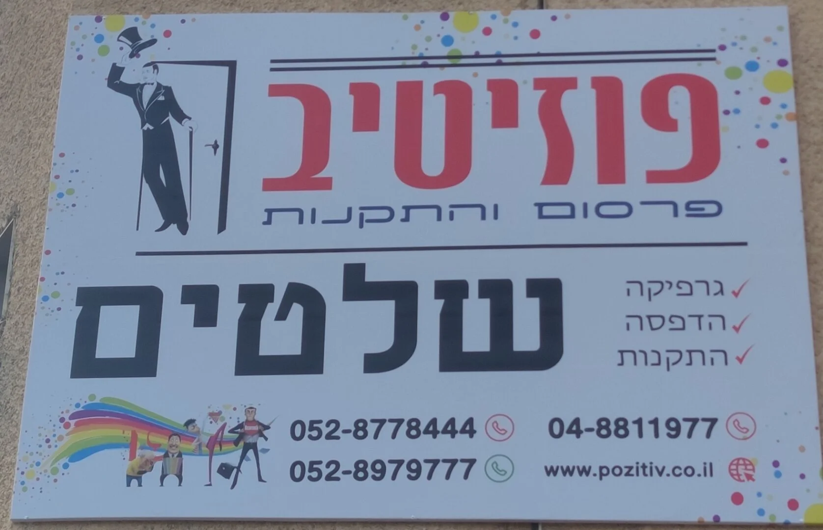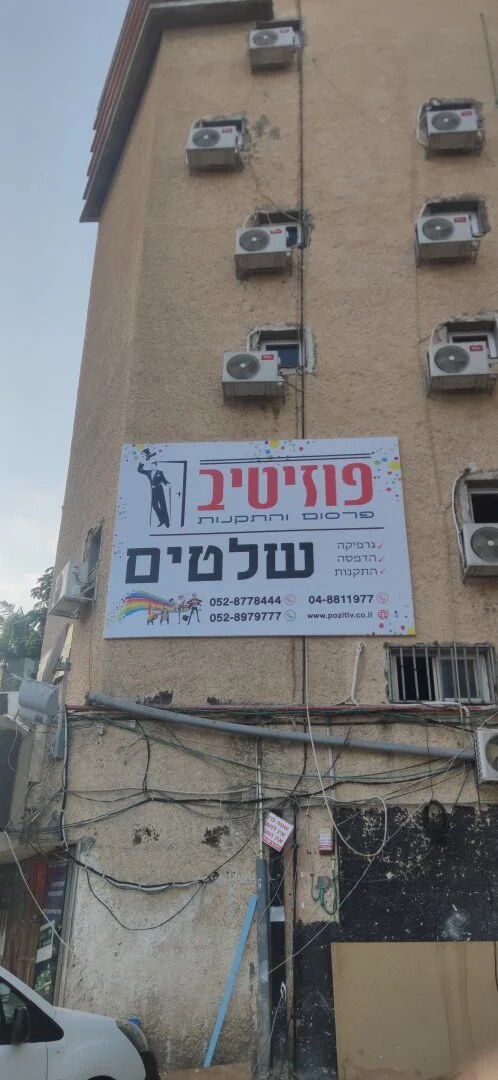 Крупный шрифт на иврите — главный акцент баннера, видимый издалека.