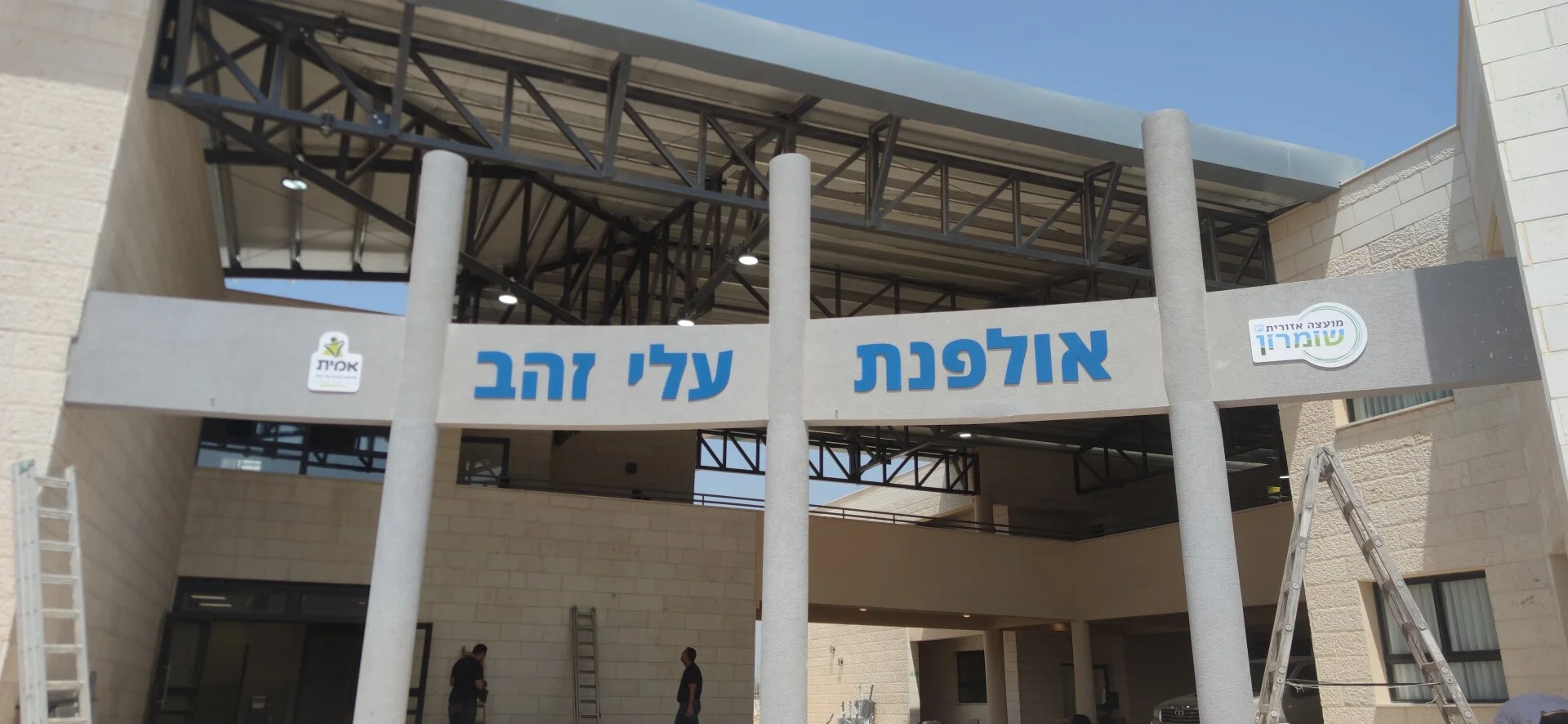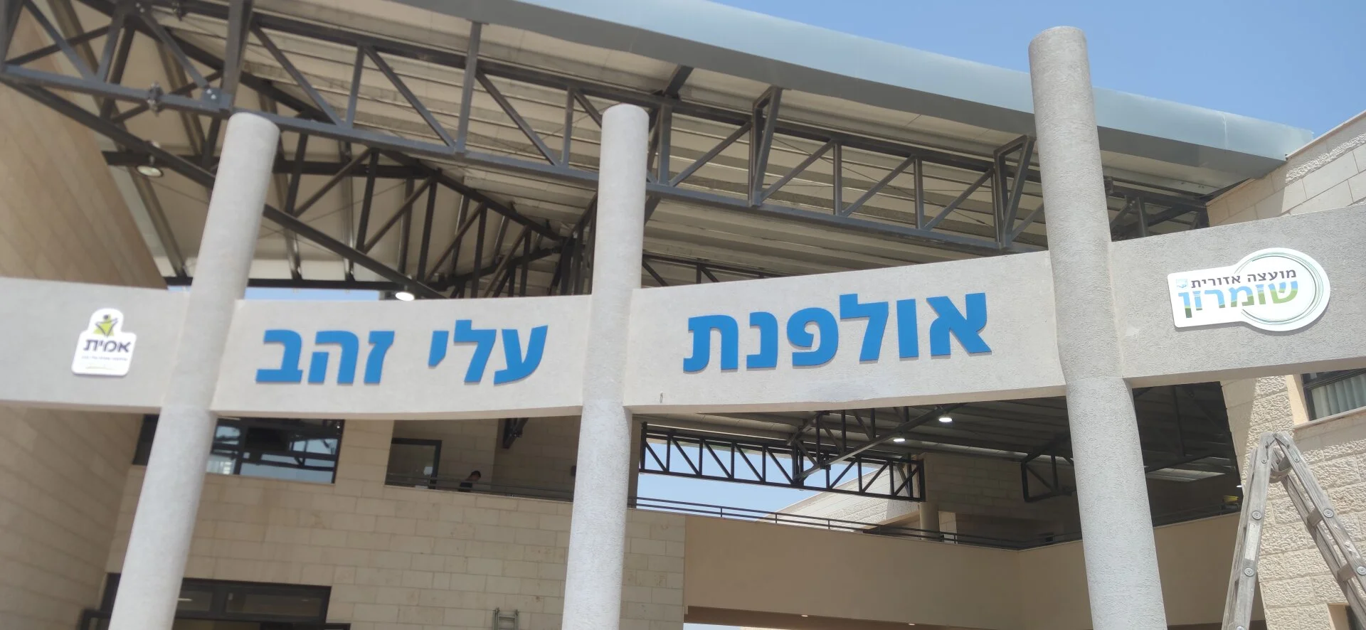 Крупный шрифт на иврите, насыщенный синий цвет — отличная читаемость с дальнего расстояния. Лаконично и статусно.
