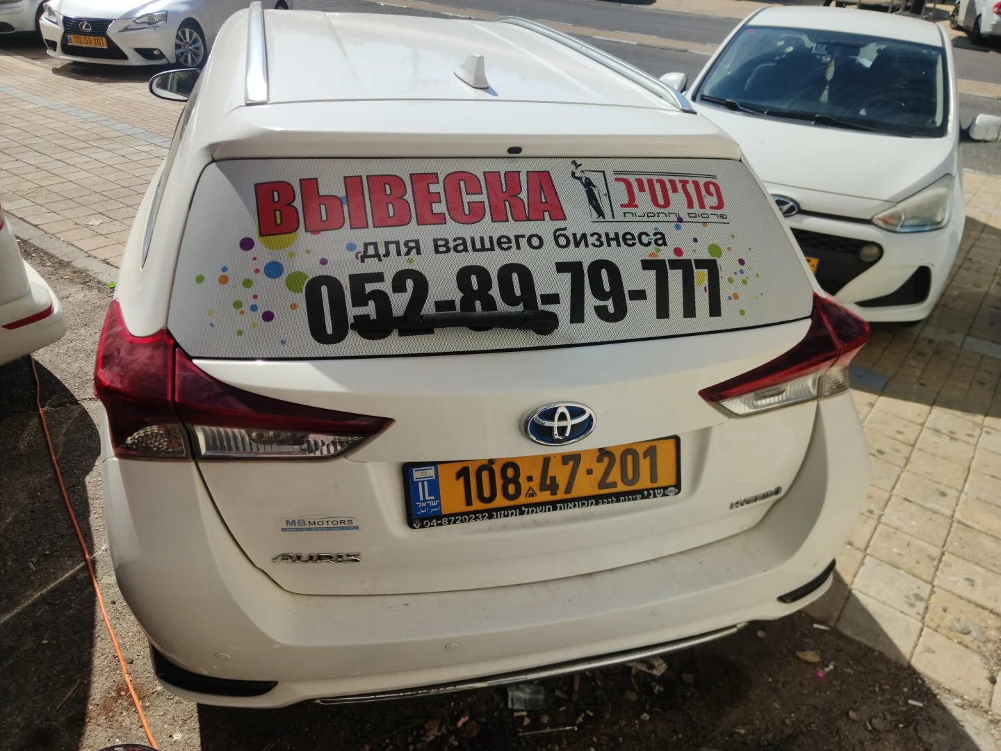 Задача: разработать и нанести наклейку, которая будет привлекать внимание участников дорожного движения и пешеходов, чётко сообщать о предлагаемых услугах, содержать контактный телефон и быть понятной для русскоязычной и ивритоязычной аудитории. Результат — яркая наклейка с текстом, цветными акцентами и дублированием информации на двух языках.