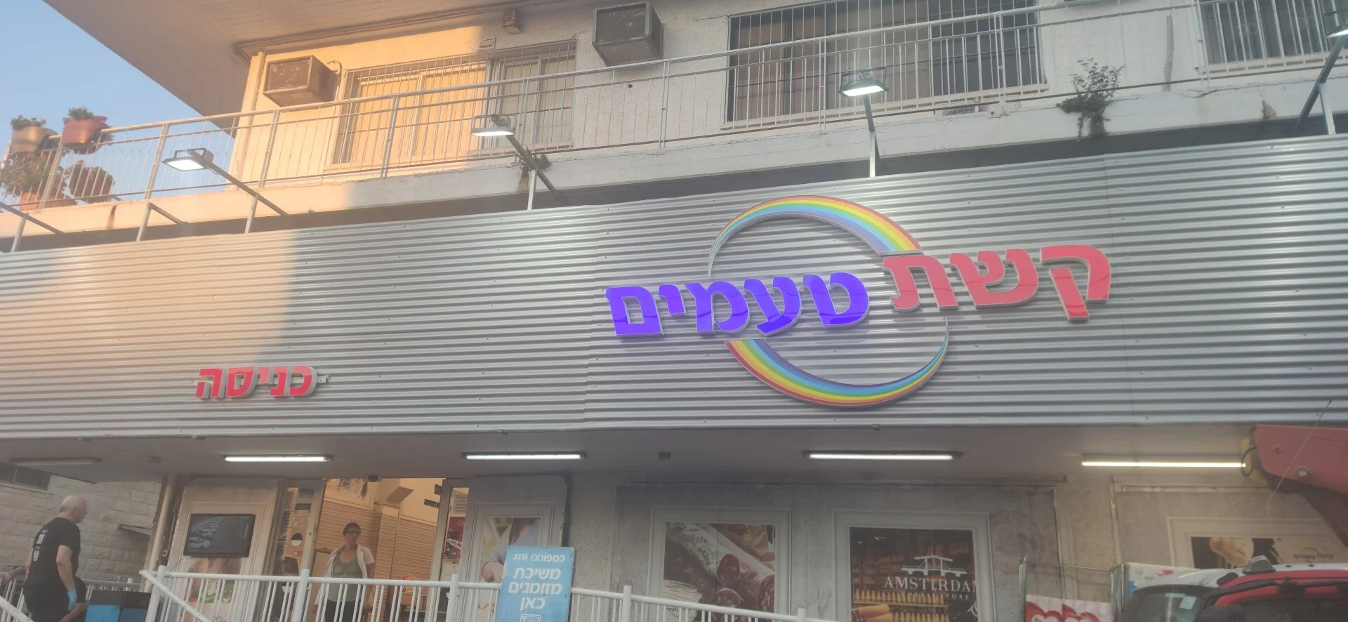 Рифлёная металлическая стена создаёт дополнительный контраст, подчёркивая яркость вывески и делая её ещё более выразительной.