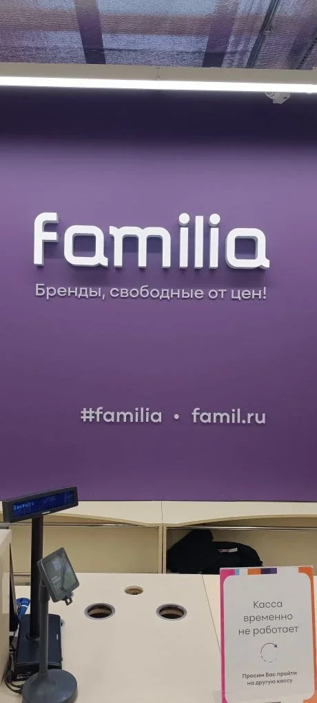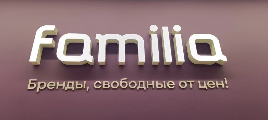 Нижняя часть вывески содержит хэштег #familia и адрес сайта famil.ru. Выполнены в едином стиле, повышают узнаваемость бренда.