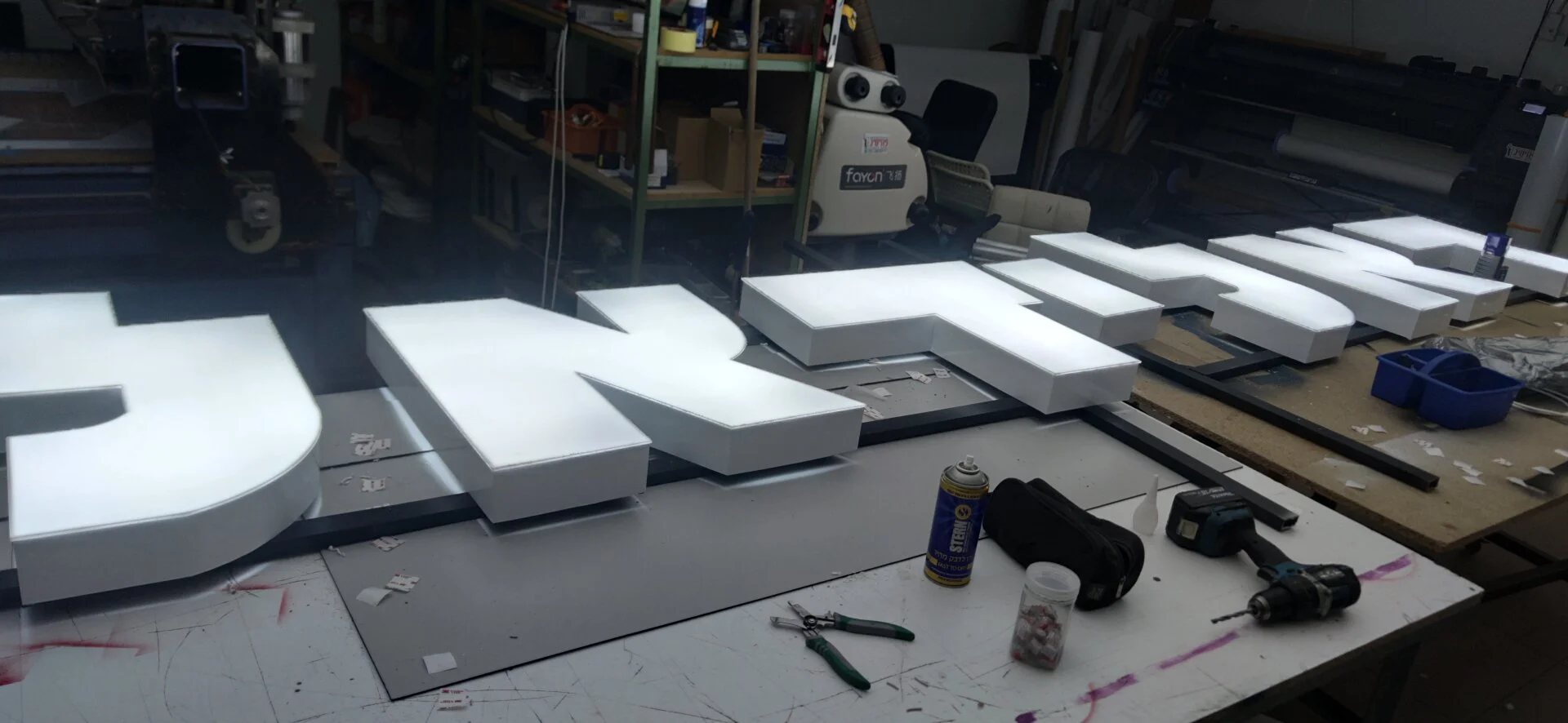 Перед вами кадр производственного процесса изготовления объёмных световых букв — один из ключевых этапов создания качественной наружной рекламы. Такие фото особенно ценны для портфолио, поскольку демонстрируют клиенту «закулисье» и подтверждают наличие собственного производства, современного оборудования и профессионального подхода на всех стадиях работы.