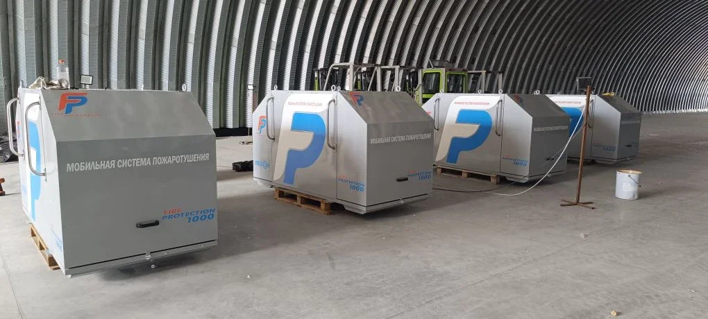 📝 Информативная маркировка: надписи «Мобильная система пожаротушения» и «FIRE PROTECTION 1000» четко передают назначение и модель оборудования.