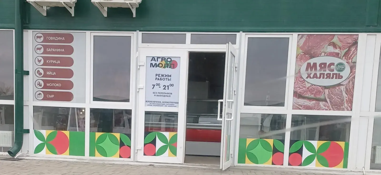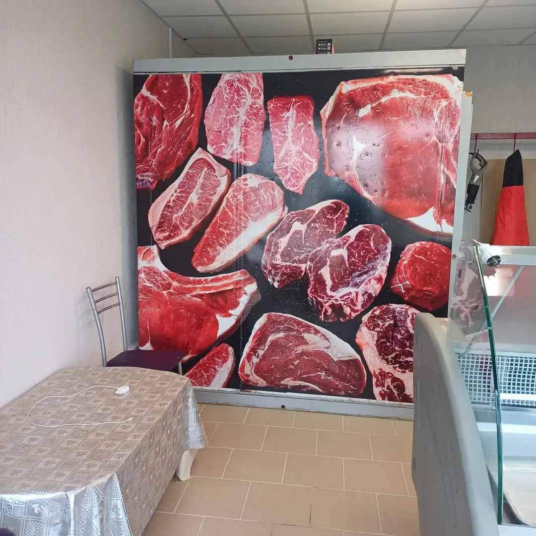 Перед вами пример комплексного оформления торговой точки по продаже мяса халяль на рынке «Агромолл» (Ростов-на-Дону, ул. Тенистая, 15). Мы выполнили: оклейку окон и дверей перфорированной плёнкой с изображением мяса и логотипом, дизайн и печать на самоклеящейся плёнке для ширмы и штендера, изготовление информационных табличек с ассортиментом (говядина, баранина, курица, яйца, молоко, сыр) и режимом работы (7:00–21:00 без выходных). Задача — сделать точку заметной, информировать покупателей и подчеркнуть соответствие стандартам халяль.