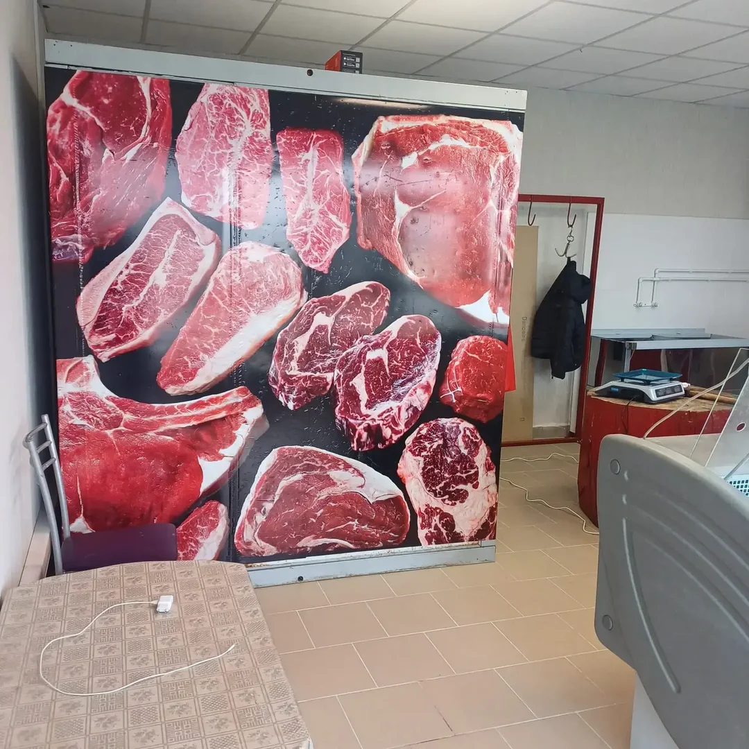 Перфорированная плёнка с изображением мяса и логотипом обеспечивает видимость с улицы, но не мешает обзору изнутри — идеально для торговых павильонов.