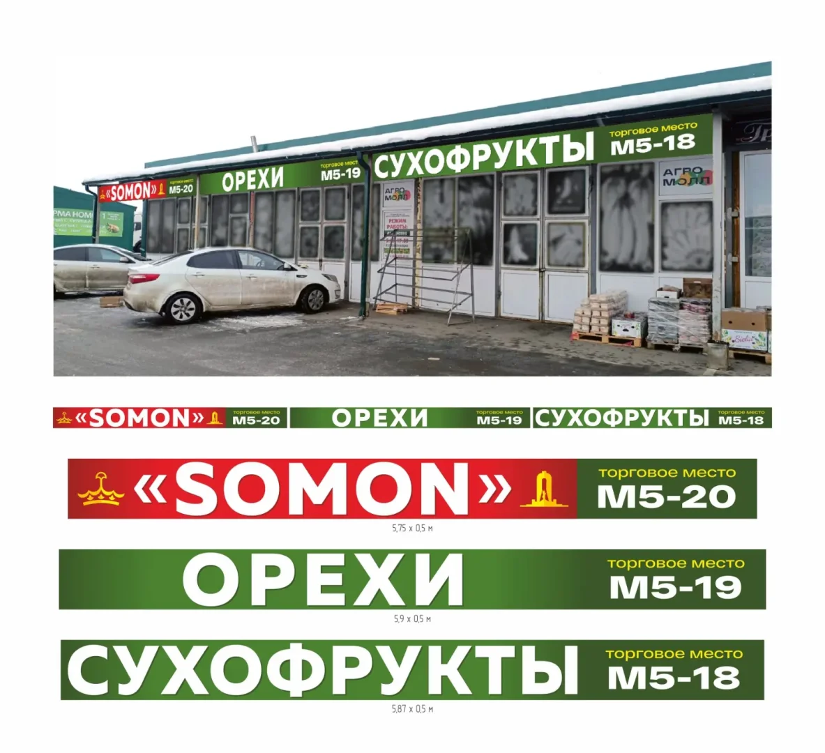 Печать и монтаж баннеров для торговых мест на рынке «Агромолл»: SOMON, орехи, сухофрукты