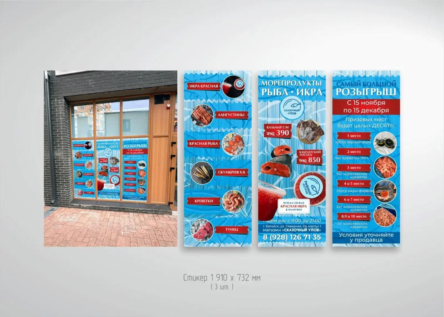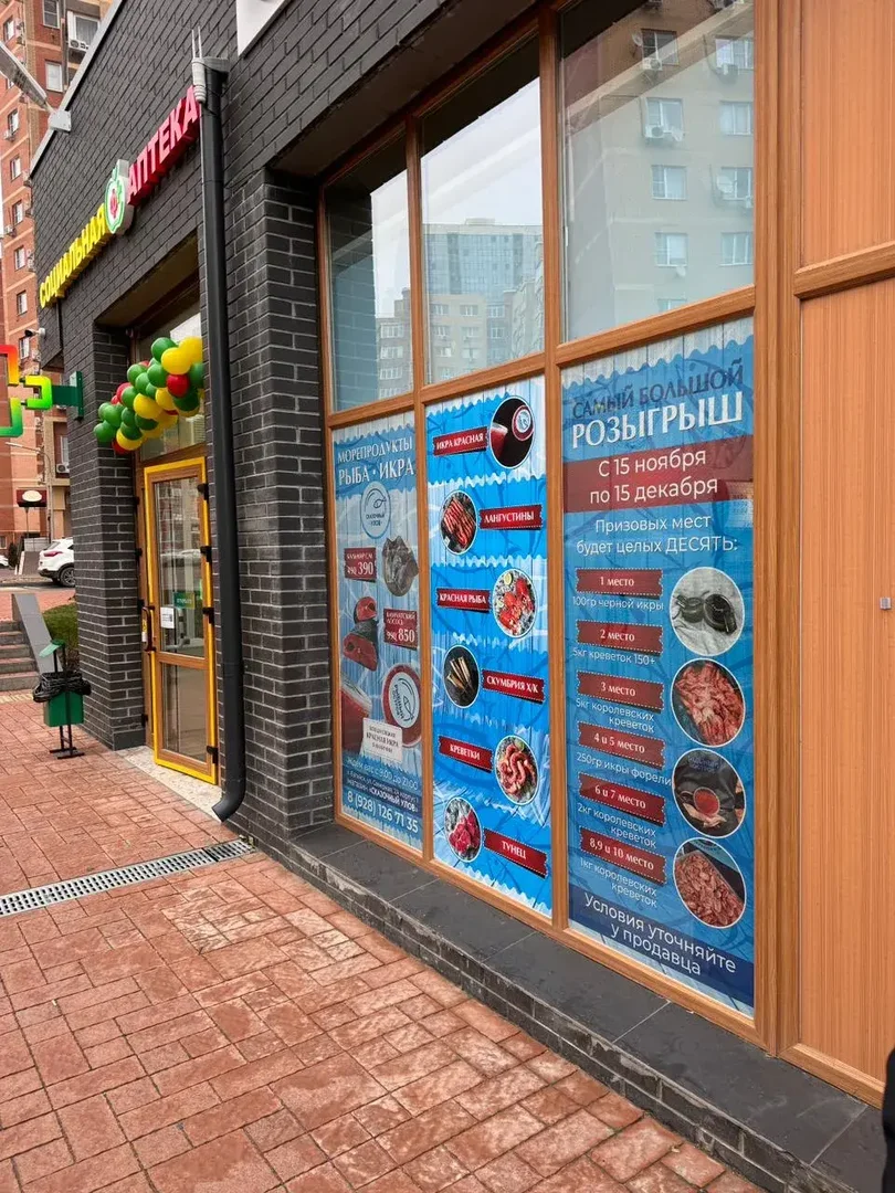 Перед вами пример комплексного оформления витрины и входной группы магазина морепродуктов «Сказочный улов» в г. Батайске (ул. Северная звезда, 2А, корп. 1). Проект включал в себя разработку дизайн-макетов, широкоформатную печать на перфорированной и сплошной ПВХ-пленке, защитную ламинацию и профессиональный монтаж. Задача заключалась в создании яркой, информативной рекламы, которая привлекает внимание, демонстрирует ассортимент и стимулирует участие в розыгрыше призов.