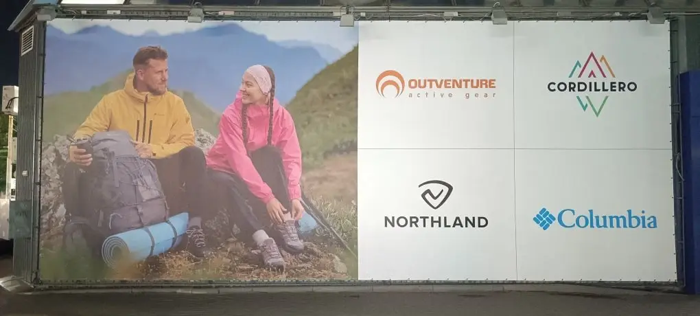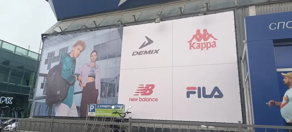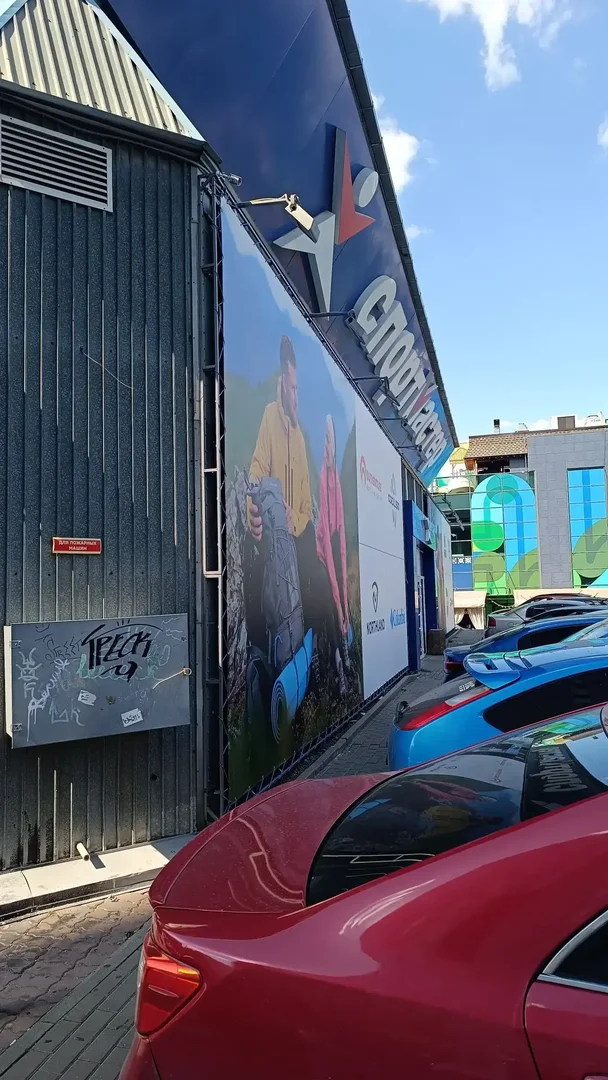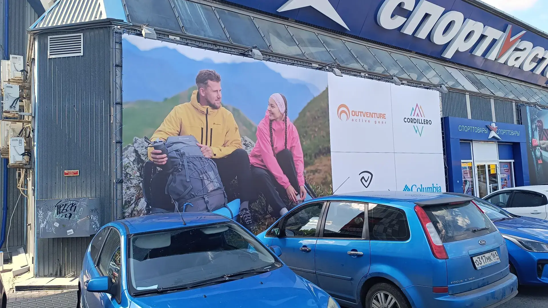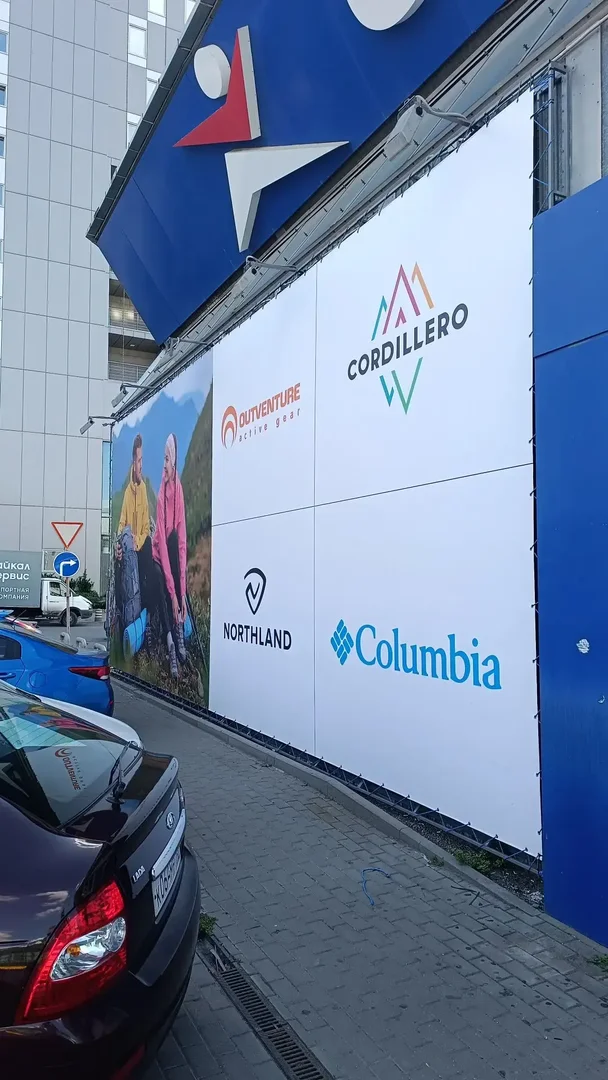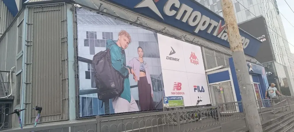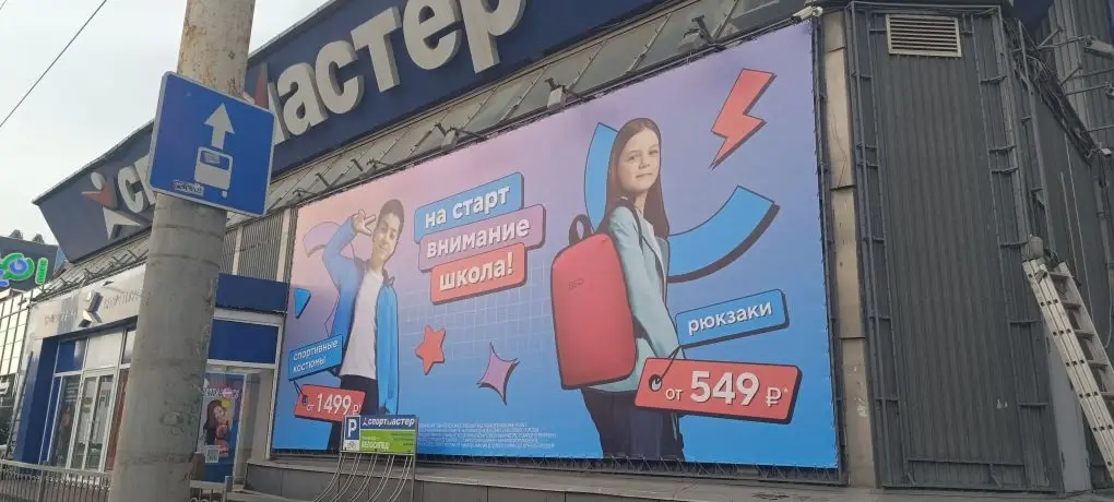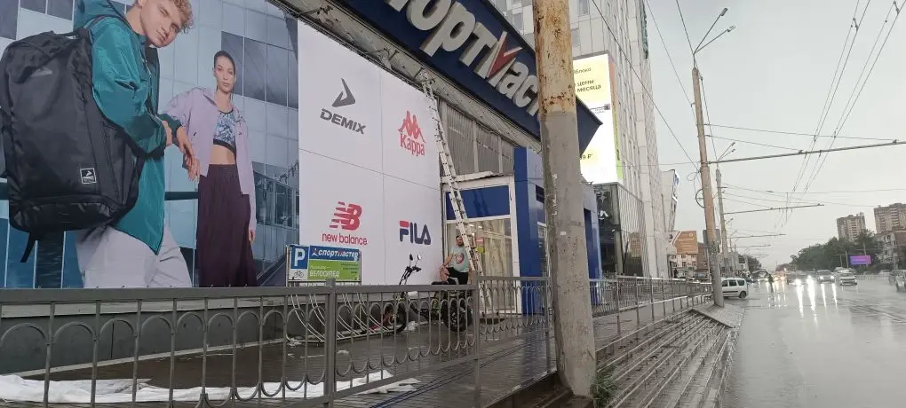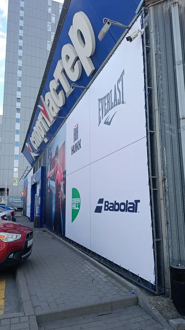 Перед вами пример профессионального монтажа баннеров любой сложности и размера для магазина «Спортмастер» по адресу: г. Ростов-на-Дону, ул. Нагибина, 34Б. Важно: дизайн и печать баннеров выполнялись не нами — заказчик предоставил готовые материалы. Наша задача заключалась в качественной установке конструкций на фасаде здания, уличных щитах и входной группе. Смонтированы баннеры с логотипами брендов (Everlast, Hukk, Babolat, Fila, Cordillero, Northland, Columbia и др.), крупноформатные постеры с изображениями людей в спортивной одежде, а также фирменные элементы сети «Спортмастер». Мы выполнили разметку, бурение, монтаж металлических каркасов, крепление баннеров через люверсы, натяжку и выравнивание. Работы проведены с соблюдением техники безопасности и расчётов на ветровую нагрузку.