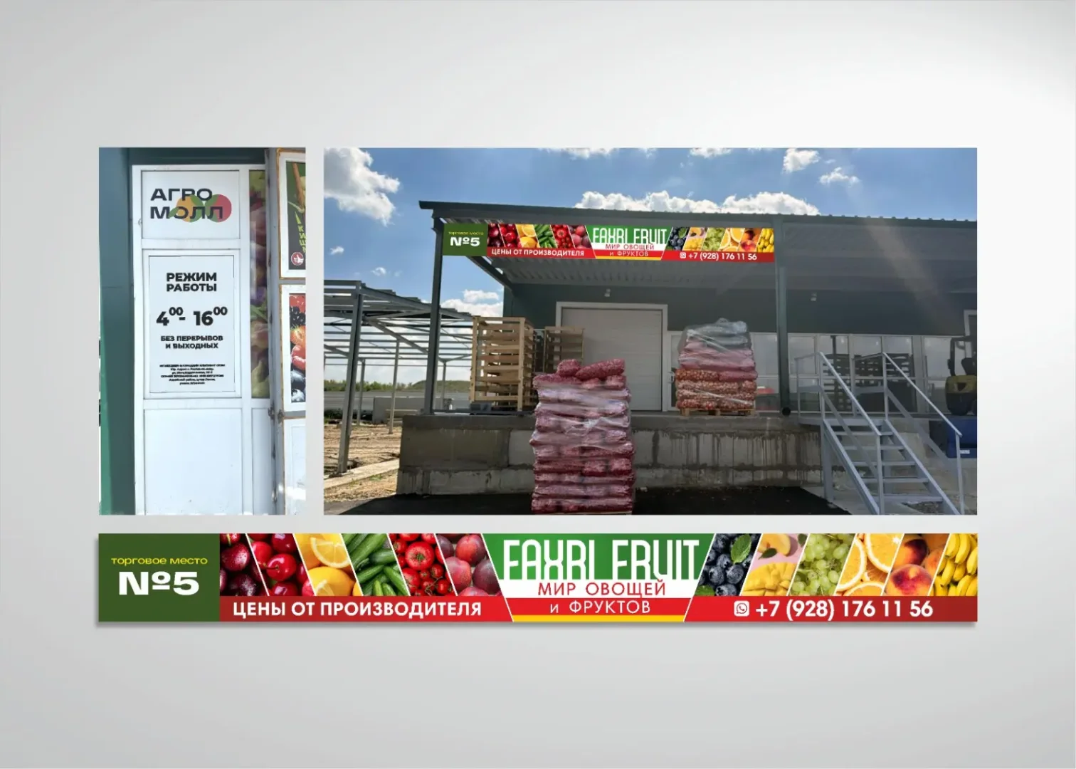Перед вами пример изготовления и монтажа баннерных конструкций для торгового места №5 на рынке «Агромолл» в Ростове-на-Дону. Проект включал в себя широкоформатную печать на баннерной ткани и установку трех типов вывесок: горизонтальной над входом в павильон «FAKRI FRUIT», вертикального баннера с режимом работы рынка и повторяющегося горизонтального баннера с полной информацией о торговом месте. Задача заключалась в создании яркого, информативного оформления, которое привлекает внимание покупателей и четко доносит информацию об ассортименте, ценах и контактах.