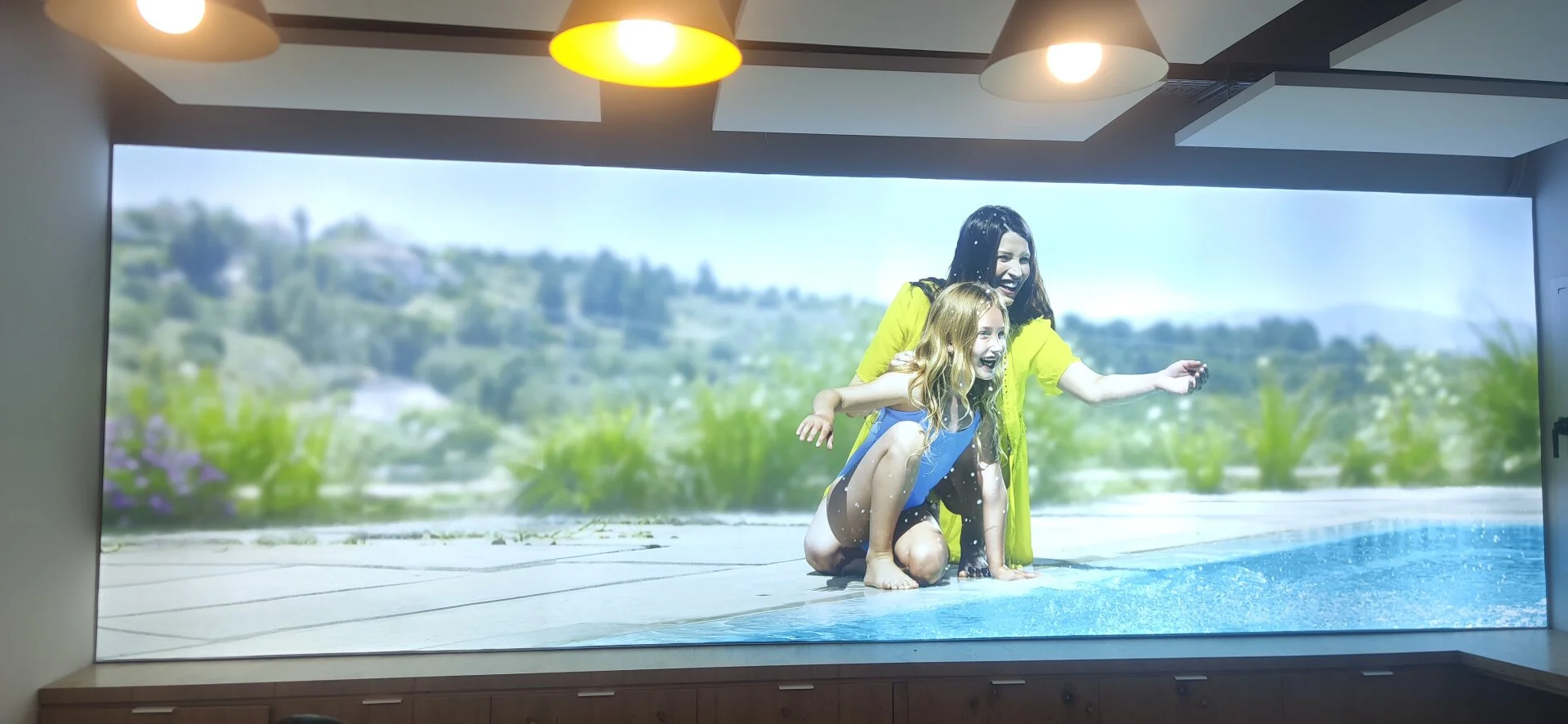 Улыбающиеся фигуры (взрослая и ребёнок) у бассейна — создают тёплую, семейную атмосферу.