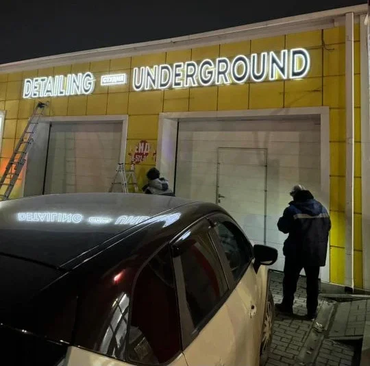Перед вами пример изготовления и монтажа объёмных световых букв без каркаса для автодетейлинг-центра «Detailing Underground» в Ростове-на-Дону. Проект включал в себя создание премиальной вывески с внутренней LED-подсветкой, которая монтируется непосредственно на фасад здания, создавая эффект «парящих» букв. Задача заключалась в том, чтобы обеспечить максимальную видимость как днём, так и ночью, подчеркнуть профессиональный статус детейлинг-центра и органично вписать вывеску в архитектуру здания.