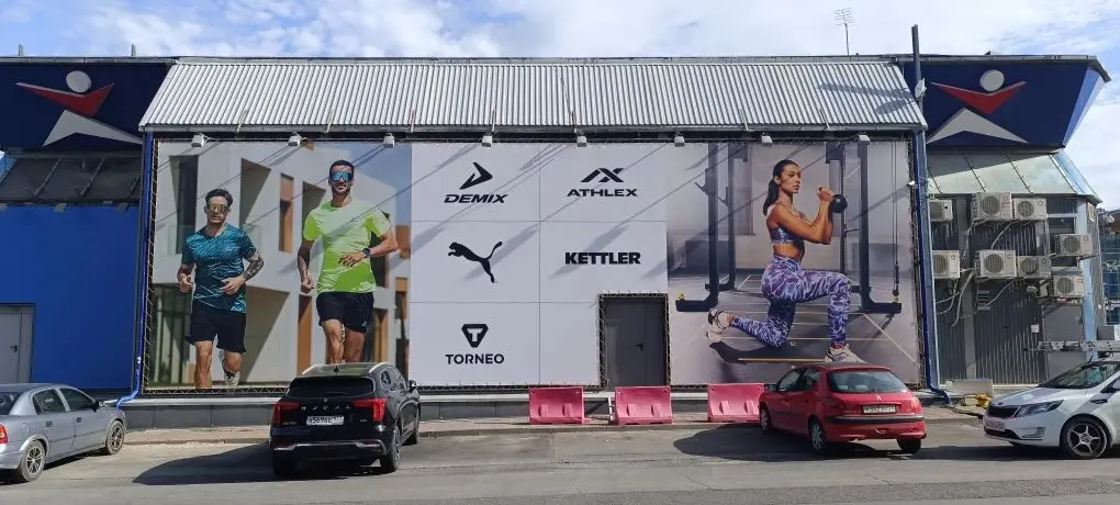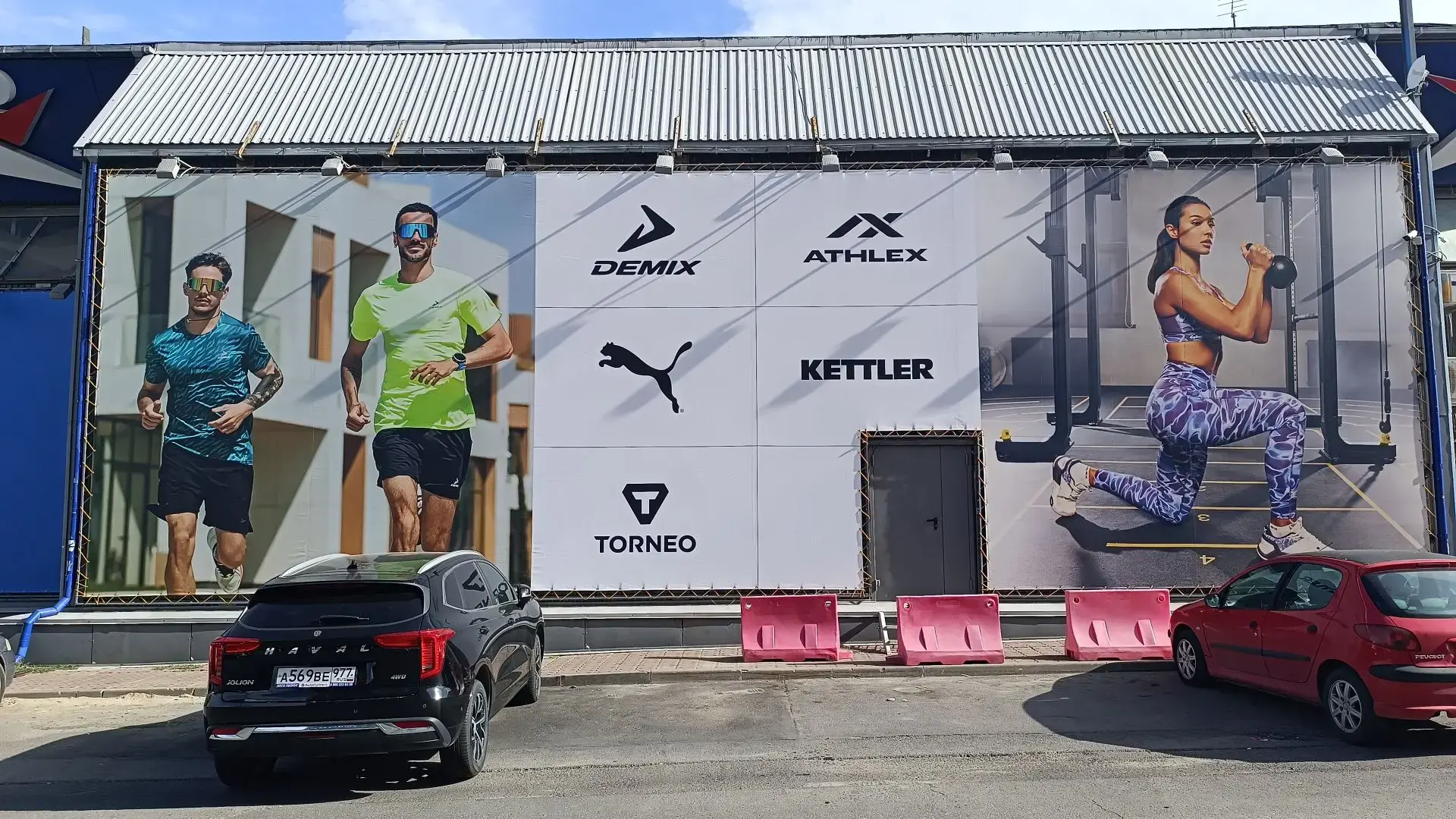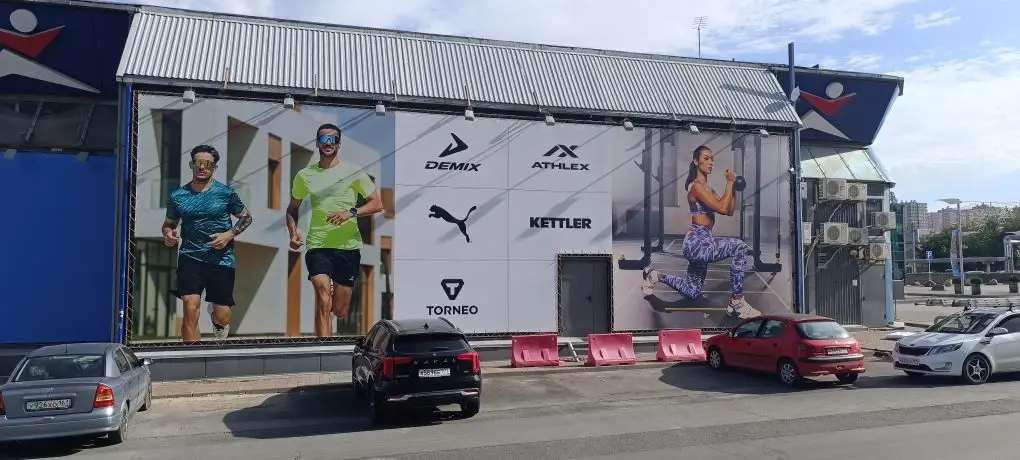 Профессиональный монтаж крупноформатного баннера для магазина «Спортмастер» (ул. Нагибина, 34Б)