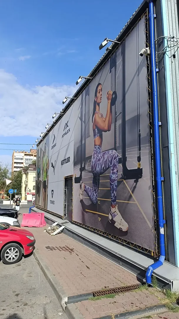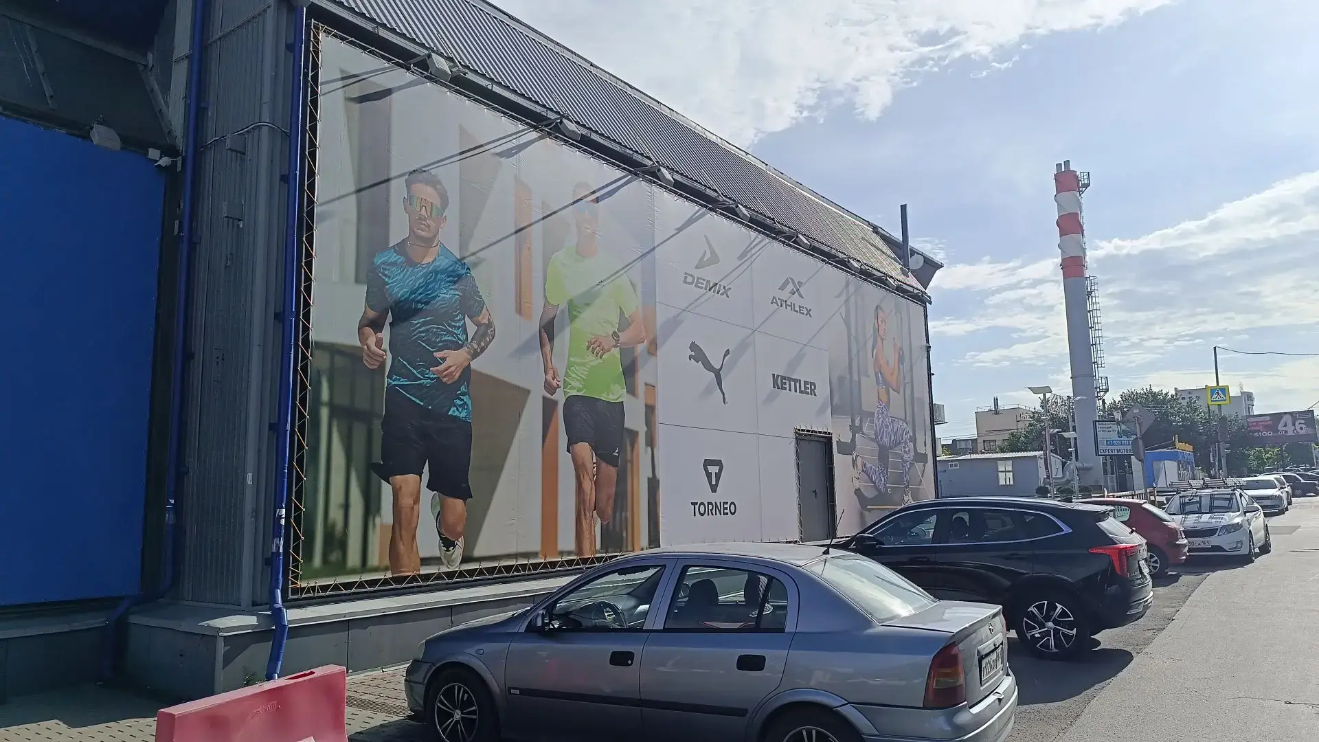 Перед вами пример профессионального монтажа крупноформатного рекламного баннера для магазина «Спортмастер» по адресу: г. Ростов-на-Дону, ул. Нагибина, 34Б. Баннер размером ≈10–15×3–5 м был доставлен заказчиком в готовом виде. Наша задача — качественно и надёжно закрепить его на фасаде здания над проезжей частью, а также смонтировать систему освещения для круглосуточной видимости. Мы выполнили: установку металлического каркаса, крепление баннера через люверсы, натяжение, выравнивание, монтаж светодиодных прожекторов (4–6 шт., 50–100 Вт) и их подключение к электросети. Работы проведены с учётом ветровых нагрузок и требований безопасности.