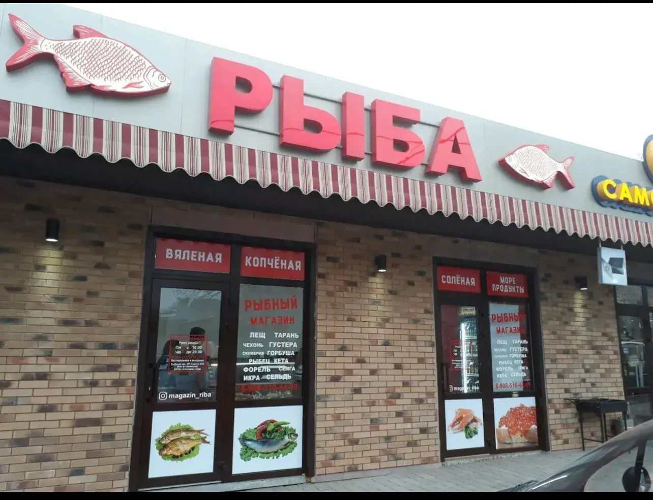Крупные красные буквы «РЫБА» и стилизованные объёмные фигуры рыб по бокам — сразу привлекают внимание и идентифицируют специализацию магазина.