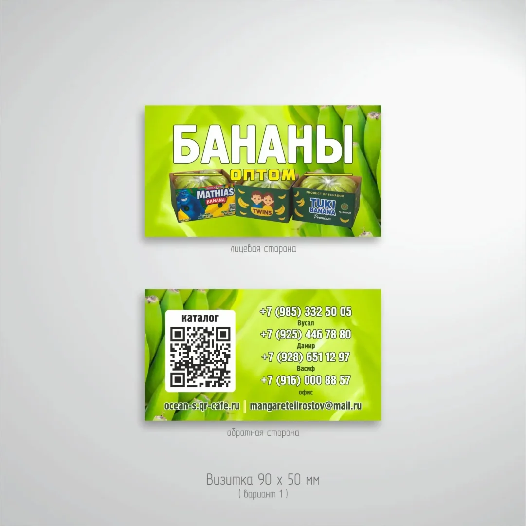 Перед вами пример разработки дизайна, изготовления и печати визиток для компании, занимающейся оптовой продажей бананов в Ростове-на-Дону. Проект включал в себя полный цикл работ: создание дизайн-концепции, согласование макета, печать на премиальной бумаге и постпечатную обработку (ламинация, резка). Задача заключалась в создании яркой, запоминающейся визитки, которая четко передает специализацию бизнеса, демонстрирует ассортимент и предоставляет удобные контакты для клиентов.
